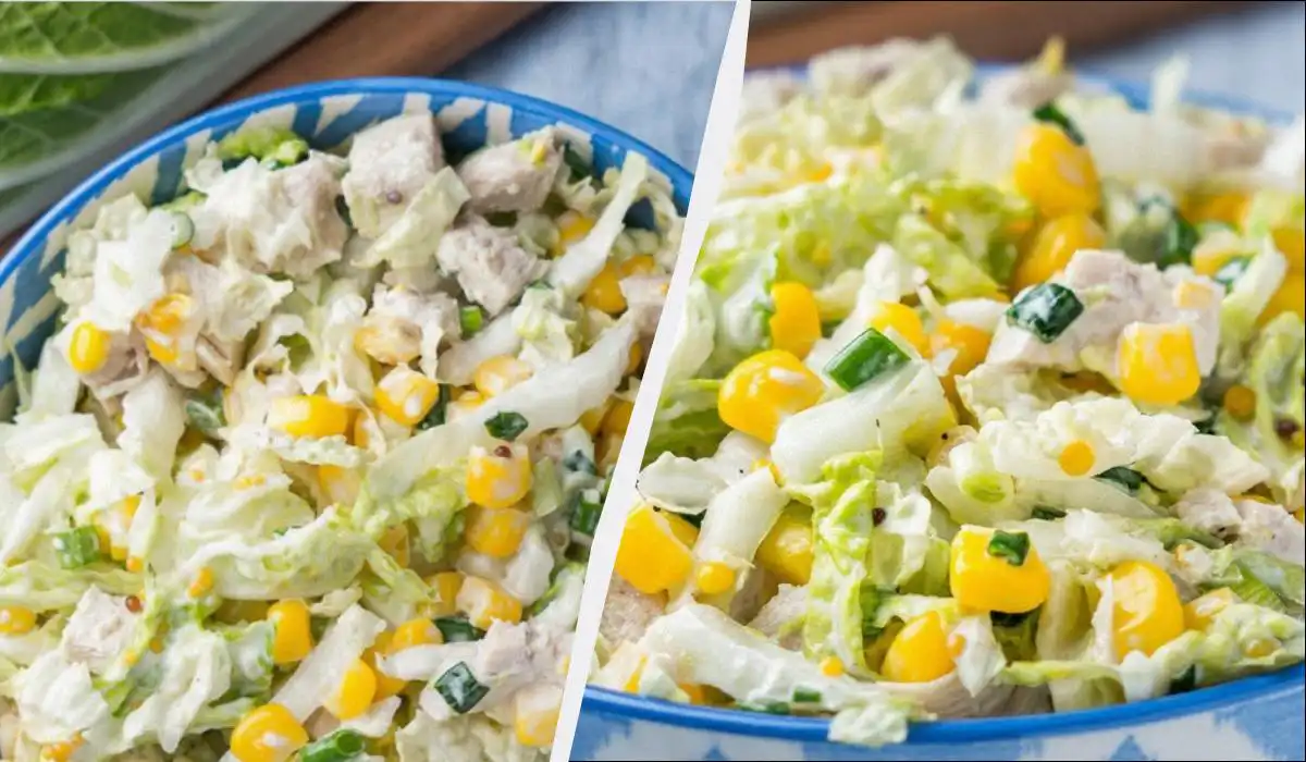Könnyen gyomorbarát saláta káposztával, csirkével és kukoricával, könnyen elkészíthető.